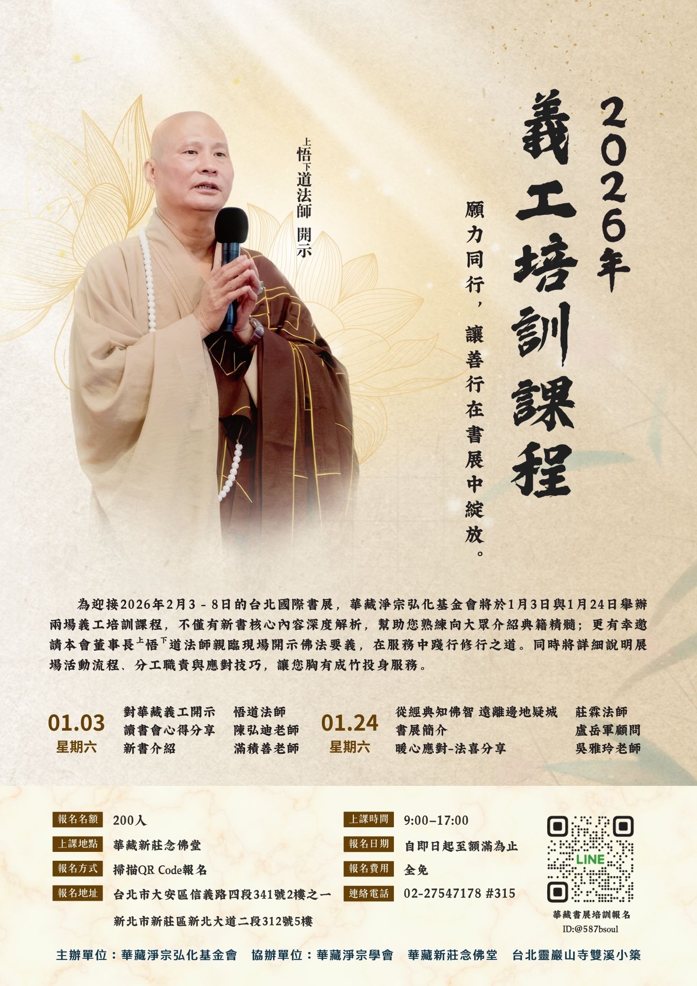 為配合本會參加2026年台北國際書展,舉辦義工培訓課程,1/3恭請 上悟下道法師開示佛法要義,在服務中踐行修行之道。網路直播,竭誠歡迎同修、蓮友大德,線上聽講共修,同霑法益。