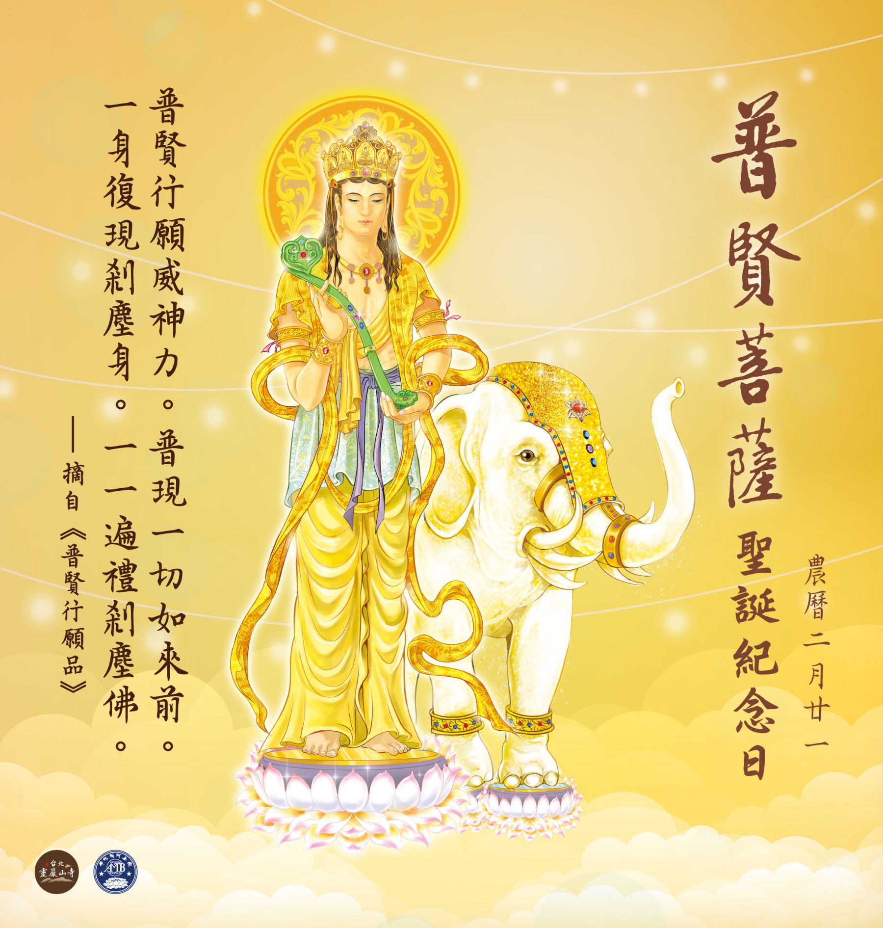 農曆二月二十一日是普賢菩薩聖誕日。普賢菩薩在《華嚴經》中代表行門,與代表解門的文殊菩薩相輔相成。解門是智慧,行門是實踐。大智文殊師利,大行普賢菩薩,二者缺一不可。