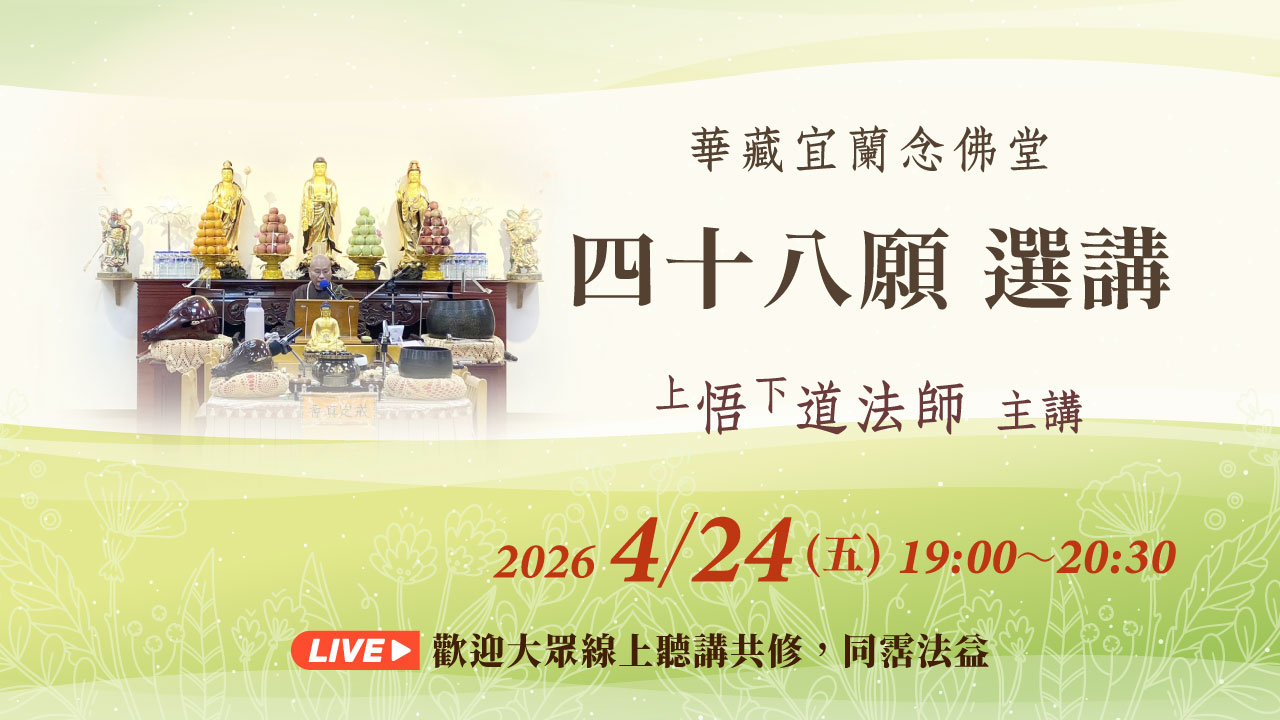 4/24 晚上7:00~8:30 悟道和尚華藏淨宗學會宜蘭念佛堂宣講《四十八願選講》,網路直播,歡迎線上聽講,相關資訊敬請參閱…
