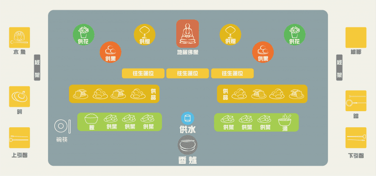 佛像、香爐、往生蓮位、供水、供燈、供花、供果、供菜、供品。
