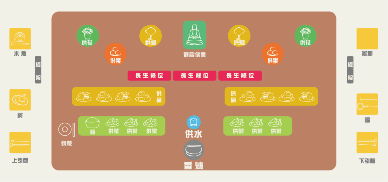 佛像、香爐、長生祿位、供水、供燈、供花、供果、供菜、供品。