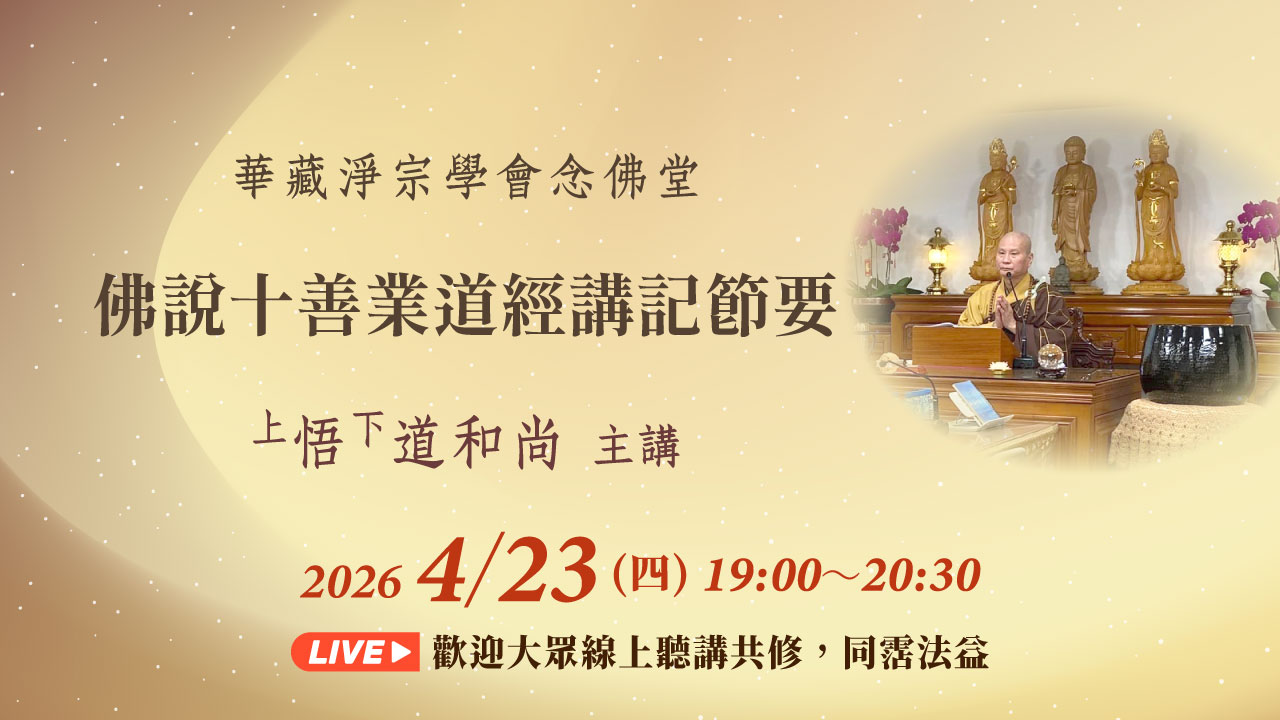 4/23(四)晚上7:00華藏念佛堂恭請悟道和尚主講《佛說十善業道經講記節要》,網路直播,歡迎大家線上聽講,同霑法益。相關資訊敬請參閱…